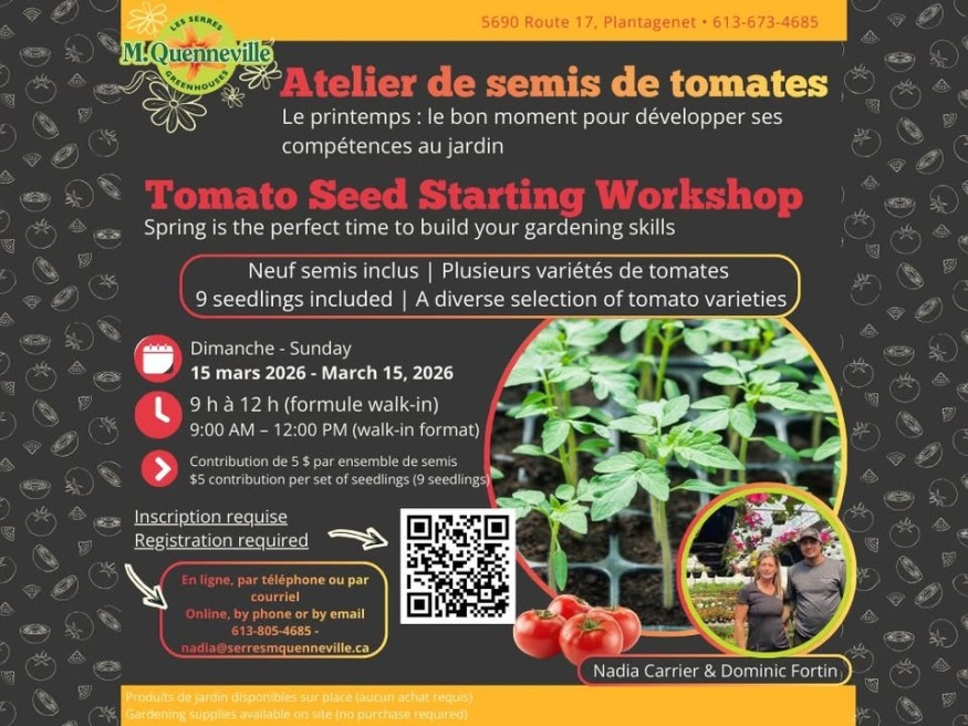 Dimanche 15 mars 2026De 9 h à 12 h (formule walk-in – arrive quand tu veux)Contribution de 5 $ par ensemble de semis (9 semis inclus), payable sur placeModes de paiement acceptés : débit, crédit et argent comptant5690 route 17, PlantagenetTout le matériel est fourniPlusieurs variétés de tomates | Neuf semis inclusL’atelier est offert avec une contribution de 5 $ (débit /crédit /comptant) par ensemble de semis (9 semis inclus), payable sur place le jour de l’événement .Inscription requiseEn ligne ici , par téléphone (613-805-4685) ou par courriel (nadia@serresmquenneville.ca)Des produits de jardin (semences, terreaux, contenants, etc.) seront disponibles à l’achat sur place pour celles et ceux qui souhaitent poursuivre leur aventure du jardin à la maison.Aucun achat requis pour participer à l’atelier.Votre jardin, notre savoir-faire.
