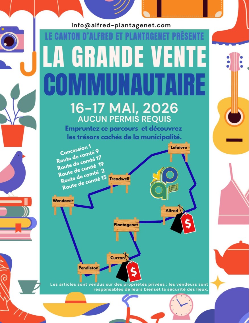 La grande vente communautaire du Canton d’Alfred et Plantagenet aura lieu les 16 et 17 mai 2026.