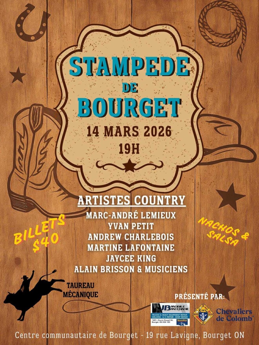 Bourget Stampede Taureau mécanique • Groupes country en direct En selle, Bourget! Le Bourget Stampede débarque en ville pour une soirée inoubliable de musique country, de bonne bouffe et de pur plaisir. Date : Samedi 14 mars 2026Heure : 19 hLieu : Centre communautaire de Bourget19, rue Lavigne, Bourget (Ontario) Spectacles en direct avec : Marc-André Lemieux Yvan Petit Andrew Charlebois Martine Lafontaine Jaycee King Alain Brisson & amis Taureau mécanique sur place — crois-tu pouvoir tenir le coup? Repas tardif inclus avec le billet Billets : 40 $ Scanne le code QR sur l’affiche ou procure-toi tes billets dès maintenant avant qu’ils ne soient épuisés. Présenté par les Chevaliers de Colomb, avec l’appui de JB Mobile Mechanic. Billets :https://thepointofsale.com/tickets/ucx260314001?lang=en https://www.facebook.com/share/1BrMtUfRx9/