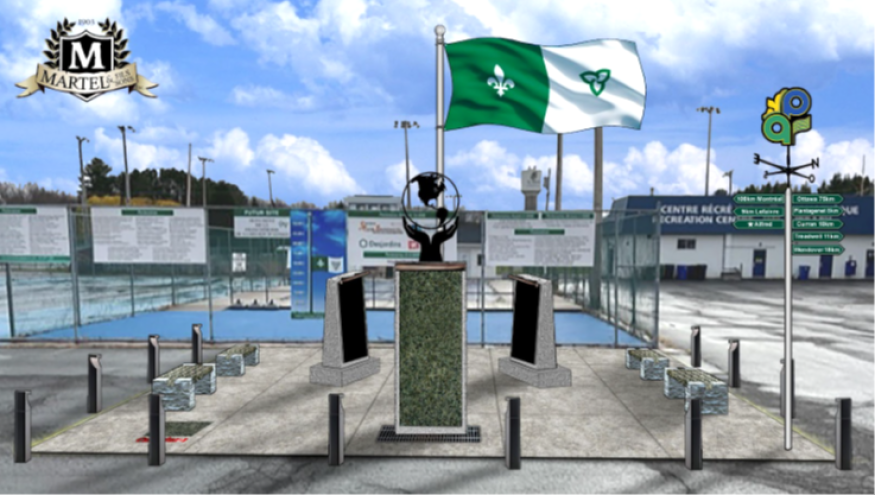 « Il y aura quatre monuments illuminés de six à sept pieds en granite gris, noir et vert. Quatre bancs gris et vert sur une plateforme de 24 pieds sur 30 pieds. Un mât de 80 pieds de hauteur, un drapeau de 15 pieds sur 30 pieds. Un poteau indicateur avec une girouette avec les villages environnants d'Alfred… et notre point d'identification national, entre Ottawa et Montréal! », énumère-t-elle, alors que le comité a aussi fourni une photo du plan de son futur ouvrage afin d’imager le tout.
