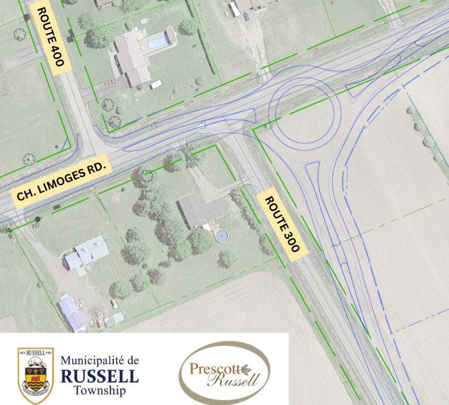 C’est aujourd’hui que commencent les travaux pour la construction du carrefour giratoire de l’intersection du chemin Limoges et de la Route 300. Chapeautés par les Comtés unis de Prescott et Russell, les travaux se termineront cet automne. L’objectif est d’améliorer la fluidité de la circulation en raison d’une croissance de la communauté. Le chemin Limoges demeurera ouvert durant la construction, mais la Route 300 sera fermée du chemin Limoges au chemin St-Thomas.