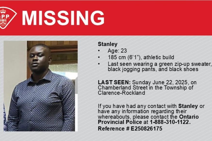 La Police provinciale de l'Ontario du détachement de Russell, sollicite l’aide du public pour retrouver un homme de 23 ans porté disparu. La personne recherchée est un homme noir mesurant 6 pieds 1 pouce et ayant une carrure athlétique. Au moment de sa disparition, il portait un coton ouaté vert à fermeture éclair, un pantalon de jogging noir et des chaussures noires. Il aurait été aperçu pour la dernière fois le dimanche 22 juin sur la rue Chamberland, à Rockland. Toute personne possédant de l’information permettant de le localiser est priée de communiquer avec la police. (Photo......