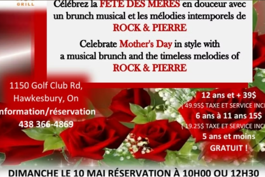 Brunch de la Fêtes des Mères Venez fêter maman le 10 mai avec le duo Rock et Pierre Taxes et services inclus dans le prix Brunch 10h ou 12h30 Réservation 438-366-4869 On vous attend pour une journée tout en chansons Billet ici ...