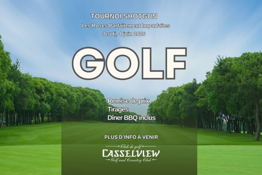 Le Tournoi de golf Les Roses Parfaitement Imparfaites aura lieu le 4 juin 2026 au Club de golf Casselview. Format shotgun, départ à 9 h. Prix et tirages seront au rendez-vous, et tous les profits seront remis à l’équipe des Roses Parfaitement Imparfaites pour soutenir leur campagne de financement en vue de leur participation à la compétition international le Rallye Roses des Sables au Mar...
