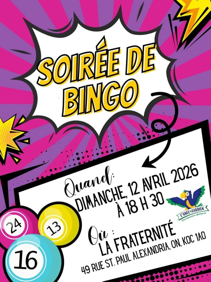 BINGO COMMUNAUTAIRE – LEVÉE DE FONDS POUR NOTRE ÉCOLE École élémentaire catholique de l'Ange-GardienJoignez-vous à nous pour une soirée de BINGO ! Une occasion idéale de se réunir, de s’amuser et de soutenir notre communauté scolaire.Dimanche 12 avril 202618 h 30Salle Fraternité d’AlexandriaInvitez vos amis et partagez l’événement en grand nombre! On vous attend!