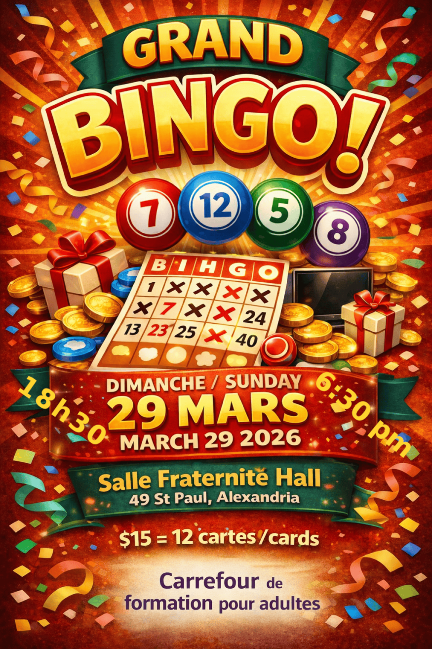 Soirée BINGO, au profit du Carrefour de formation pour adultes d'Alexandria, dimanche le 29 mars, à compter de 18h30, à la Salle Fraternité, 49, rue St-Paul, d'Alexandria. Le Carrefour est un organisme communautaire, qui propose depuis 1988 des formations diversifiées, centrées sur les besoins de ses apprenants, incluant des cours en mathématiques, français, informatique, employabilité et bien plus encore. Pour plus de renseignements, consultez le site carrefourformation.com ou composez le 613 525-4194.