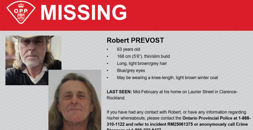 La Police Provinciale de l’Ontario du détachement de Russell demande l’aide du public pour retrouver Robert Prevost, 63 ans, porté disparu à Rockland. Il a été vu pour la dernière fois à son domicile sur la rue Laurier à la mi-février. L’homme mesure 5 pieds 6, mince, cheveux longs brun clair et gris avec les yeux bleu-gris. Il pourrait porter un manteau d’hiver brun clair mi-long. Toute information peut être signalée à la PPO du comté de Russell.