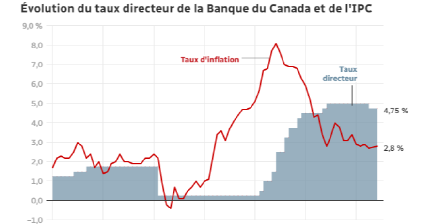 Un rapport de Statistique Canada montre que l’indice des prix à la consommation sur une base annuelle s’établissait à 2,7 % le mois dernier, un ralentissement de 0,2 % par rapport aux données de mai. Après avoir grimpé à 2,9 % en mai, l’inflation est repassée à 2,7% en juin, une des raisons principales étant que le prix de l’essence a connu une augmentation moins marquée. Les prix du carburant à la pompe ont progressé de 0,4% en juin après avoir progressé de 5,6% en mai. L’inflation sur une base annuelle a ralenti dans six provinces au cours des derniers mois. Outre l’essence, une baisse de 1,8 % d’une année à l’autre du prix des biens durables comme les électroménagers, les meubles, les voitures ont contribué au ralentissement de l’inflation le mois dernier. La Banque du Canada, qui a consenti en juin a une baisse de son taux directeur à 4,75 %, doit se prononcer de nouveau le 24 juillet sur la suite des choses.